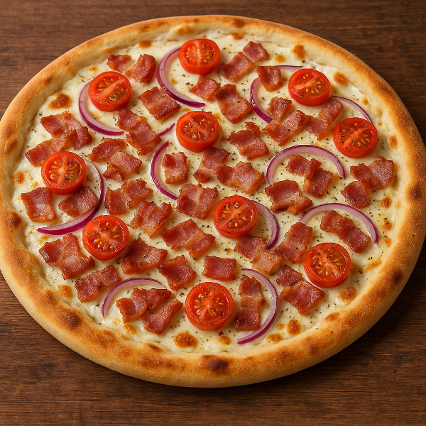 Jeder Biss dieser Pizza ist ein harmonisches Zusammenspiel aus cremiger Milde, herzhafter Tiefe und fruchtiger Frische. Der Bacon bringt ein rauchiges Aroma, das wunderbar mit der milden Crème Fraîche harmoniert. Die Cherry Tomaten sorgen für eine leichte Süße, während die roten Zwiebeln eine würzige Frische beisteuern. Der frisch gemahlene Steakpfeffer nach dem Backen hebt den Geschmack auf ein neues Level – aromatisch, intensiv und ausgewogen.